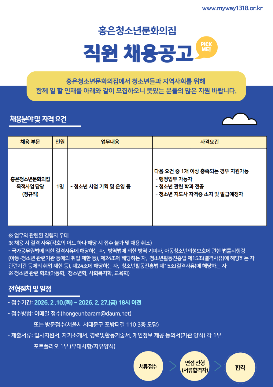 [구인] 홍은청소년문화의집 [정규직] 채용 공고